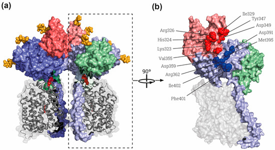 - Fort, J.; de la Ballina, L.R.; Burghardt, H.E.; Ferrer-Costa, C.; Turnay, J.; Ferrer-Orta, C.; Usón, I.; Zorzano, A.; Fernández-Recio, J.; Orozco, M.; et al. The Structure of Human 4F2hc Ectodomain Provides a Model for Homodimerization and Electrostatic Interaction with Plasma Membrane. J. Biol. Chem. 2007, 282, 31444–31452. [Google Scholar] [CrossRef] [PubMed]