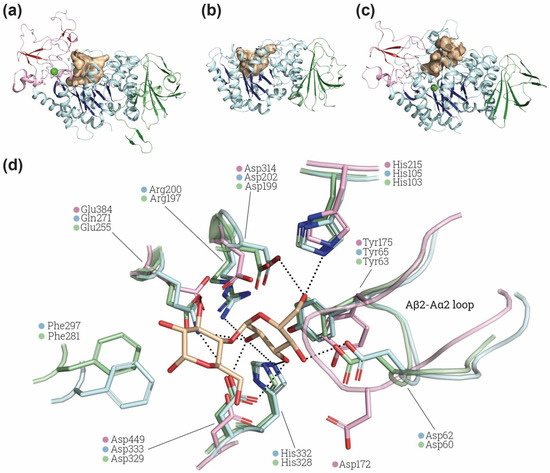 α-glucosidase active site comparison. Structural comparison of the substrate cavity between rBAT-ED (PDB: 6LI9 [9]) (a), 4F2hc-ED (PDB: 6IRT [37]) (b) and Halomonas sp. H11 α-glucosidase (HaG) (PDB: 3WY4 [65]) (c). The cavities of all the structures are shown in light brown and domains A, B and C in blue, red and green, respectively, β-sheets are more brightly colored. Ions (Ca2+ and Mg2+ for rBAT and HaG respectively) are indicated in light green. Cavity area and volume were also measured using the Computed Atlas of Surface Topography of proteins (CASTp) plugin [67] on PyMol. Calculated areas for cavities are 633.32 Å2, 802.78 Å2 and 802.78 Å2 for 4F2hc, rBAT and HaG, respectively. (d) Detailed view of HaG (light blue) (PDB: 3WY4) and oligo-1,6-glucosidase of B. cereus (light green) (PDB: 1UOK [68]) binding pocket and the conserved residues found in rBAT (light pink) (PDB: 6LI9). Maltose is labelled in light brown. Non-conserved residues of rBAT are not shown. Images were created with the PyMol Molecular Graphics System, Version 2.1.4., Schrödinger, LLC.