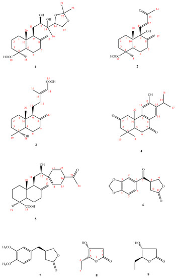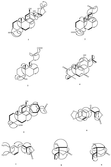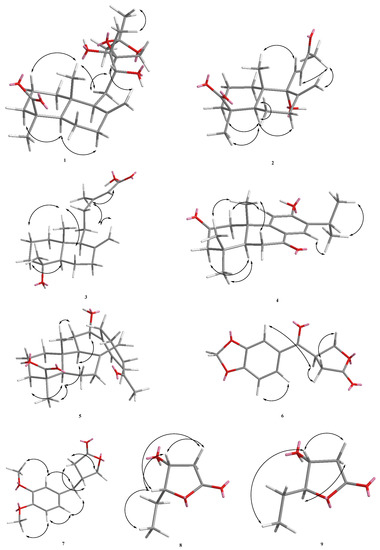 The following are available online, Figure S1. 1H NMR spectrum of 1; Figure S2. 13C NMR spectrum of 1; Figure S3. 1H-1H COSY spectrum of 1; Figure S4. HMBC spectrum of 1; Figure S5. NOESY spectrum of 1; Figure S6. HSQC spectrum of 1; Figure S7. EI-MS spectrum of 1; Figure S8. 1H NMR spectrum of 2; Figure S9. 13C NMR spectrum of 2; Figure S10. 1H-1H COSY spectrum of 2; Figure S11. HMBC spectrum of 2; Figure S12. NOESY spectrum of 2; Figure S13. HSQC spectrum of 2; Figure S14. EI-MS spectrum of 2; Figure S15. 1H NMR spectrum of 3; Figure S16. 13C NMR spectrum of 3; Figure S17. 1H-1H COSY spectrum of 3; Figure S18. HMBC spectrum of 3; Figure S19. NOESY spectrum of 3; Figure S20. HSQC spectrum of 3; Figure S21. EI-MS spectrum of 3; Figure S22. 1H NMR spectrum of 4; Figure S23. 13C NMR spectrum of 4; Figure S24. 1H-1H COSY spectrum of 4; Figure S25. HMBC spectrum of 4; Figure S26. NOESY spectrum of 4; Figure S27. HSQC spectrum of 4; Figure S28. EI-MS spectrum of 4; Figure S29. 1H NMR spectrum of 5; Figure S30. 13C NMR spectrum of 5; Figure S31. 1H-1H COSY spectrum of 5; Figure S32. HMBC spectrum of 5; Figure S33. NOESY spectrum of 5; Figure S34. HSQC spectrum of 5; Figure S35. EI-MS spectrum of 5; Figure S36. 1H NMR spectrum of 6; Figure S37. 13C NMR/DEPT spectra of 6; Figure S38. 1H-1H COSY spectrum of 6; Figure S39. HMBC spectrum of 6; Figure S40. NOESY spectrum of 6; Figure S41. HSQC spectrum of 6; Figure S42. EI-MS spectrum of 6; Figure S43. 1H NMR spectrum of 7; Figure S44. 13C NMR/DEPT spectra of 7; Figure S45. 1H-1H COSY spectrum of 7; Figure S46. HMBC spectrum of 7; Figure S47. NOESY spectrum of 7; Figure S48. HSQC spectrum of 7; Figure S49. EI-MS spectrum of 7; Figure S50. 1H NMR spectrum of 8; Figure S51. 13C NMR/DEPT spectra of 8; Figure S52. 1H-1H COSY spectrum of 8; Figure S53. HMBC spectrum of 8; Figure S54. NOESY spectrum of 8; Figure S55. HSQC spectrum of 8; Figure S56. EI-MS spectrum of 8; Figure S57. 1H NMR spectrum of 9; Figure S58. 13C NMR/DEPT spectra of 9; Figure S59. 1H-1H COSY spectrum of 9; Figure S60. HMBC spectrum of 9; Figure S61. NOESY spectrum of 9; Figure S62. HSQC spectrum of 9; Figure S63. EI-MS spectrum of 9.