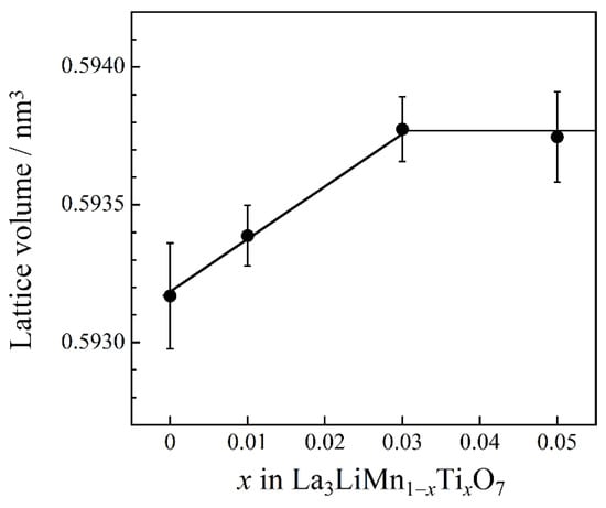 Compositional dependence of the lattice volume for La3LiMn1−xTixO7 (0 ≤ x ≤ 0.05).