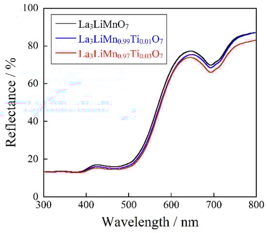 The UV–Vis reflectance spectra of the La3LiMn1−xTixO7 (0 ≤ x ≤ 0.03) samples, which were obtained in a single-phase form, are depicted in Figure 4. The optical absorption below 400 nm in the UV light region corresponded to the O2p-Mn3d charge transfer transition, while those around 500 and 690 nm in the visible region were attributed to the d-d transition of Mn4+. The former was spin-allowed 4A2g–4T2g transition and the latter was spin-forbidden 4A2g22122Eg and 4A2g–2T1g transitions, respectively [22,26,27,28].