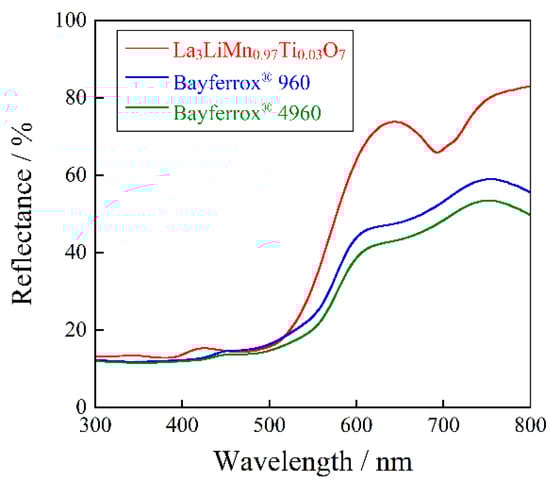 The UV–Vis reflectance spectrum of La3LiMn0.97Ti0.03O7 was compared to those of the commercial orange pigments such as Bayferrox® 960 and Bayferrox® 4960 (Fe2O3-FeOOH, Ozeki), as shown in Figure 5. The reflectance values in the green-blue light region (480–490 nm), corresponding to the complementary color of orange, of the current La3LiMn0.97Ti0.03O7 and commercial pigments were almost the same. On the other hand, the La3LiMn0.97Ti0.03O7 pigment showed higher reflectance in the yellow-red light region (580–750 nm) than those of the conventional ones. Accordingly, the La3LiMn0.97Ti0.03O7 pigment exhibited more vibrant orange color than the commercially available orange pigments.