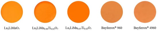 Photographs of the La3LiMn1−xTixO7 (0 ≤ x ≤ 0.03) and commercially available orange Bayferrox® 960 and Bayferrox® 4960 pigments.