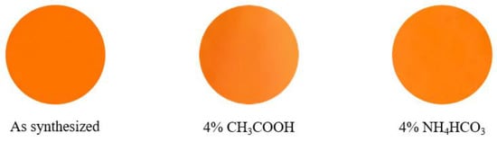 The chemical stability of the La3LiMn0.97Ti0.03O7 pigment was tested in the acid/base solutions. The pigment was dispersed into the 4% acetic acid and 4% ammonium bicarbonate solutions. These sample solutions for the acid and base conditions were left at room temperature for 1 and 24 h. After that, the samples were washed with deionized water and ethanol, and then dried at room temperature. The color of the pigment after the chemical stability test was evaluated by using the colorimeter. The L*a*b*Ch° color coordinate data of the La3LiMn0.97Ti0.03O7 pigment before and after the soaking test are tabulated in Table 4, and the photographs are also displayed in Figure 7. After the soaking test, the b* value decreased slightly, but the h° value was almost constant and no significant color degradation was observed.