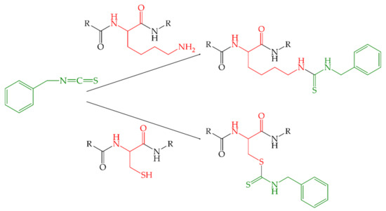 Due to their high electrophilicity, ITC can interact with proteins in a diverse bunch of foods. They react with nucleophilic groups such as thiol and amino groups in proteins to form thiocarbamates and thioureas (Figure 1), and thus have a significant influence on various protein properties [5].