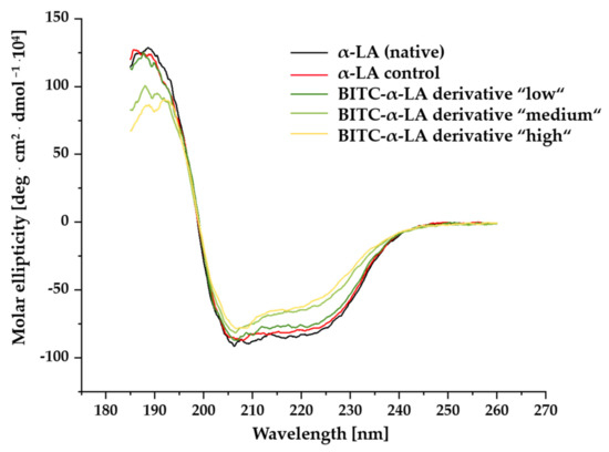 To gain a better understanding of the structural effects of BITC conjugation, the CD spectra of all samples were subjected to quantitative measurement to evaluate the secondary structure and/or to estimate the changes caused in the secondary structure. Quantitative determination of the percentages of secondary structures of three BITC-α-LA derivatives “low”, “medium” and “high”; the untreated control sample; and the native α-LA was performed using the K2d method in DichroWeb (http://dichroweb.cryst.bbk.ac.uk/html/links.shtml; accessed on 10 October 2021) and is summarized in Table 2.