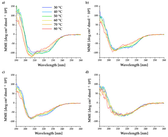 In the following, under the aspect of evaluating the temperature-induced conformational changes of BITC-α-LA derivatives, far-UV CD spectroscopy was performed at different temperatures. Knowledge about the temperature-dependent folding stability of α-LA is of great interest in food technology, as it significantly influences the functional and nutritional properties of foods (e.g., dairy products in the case of α-LA). For this purpose, CD spectra of the untreated and BITC-treated α-LA were recorded in a temperature range from 30 to 80 °C with a heating interval of 2 °C/min. Figure 4 shows the CD spectra of the unmodified α-LA control (a) and the BITC-α-LA derivatives “low” (b), “medium” (c), and “high” (d).
