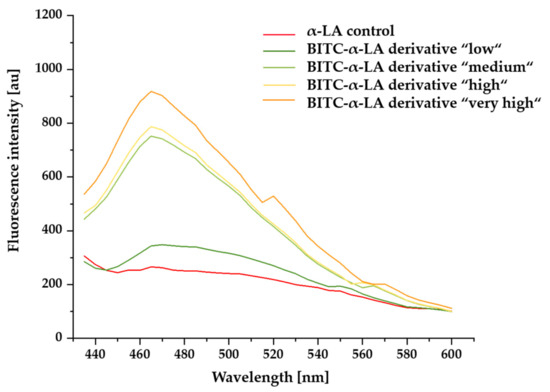Low fluorescence emission was observed in the presence of unmodified α-LA (Figure 5, red curve). Depending on the degree of BITC modification, a difference in fluorescence intensity between the measured samples was documented. While the control sample showed a low fluorescence intensity compared to the BITC-treated protein derivatives, a significant increase in ANS fluorescence and a shift of the fluorescence maximum was observed with an increasing degree of modification. Measurement of the ANS fluorescence of the BITC-α-LA derivative “low” showed only a slight increase in intensity and hardly any effect on the position of the fluorescence maximum (Figure 5, dark green curve). With an increasing degree of modification of the α-LA derivatives, the ANS quantum yield could be increased up to a threefold value, and a blue shift of the fluorescence maximum was observed.
