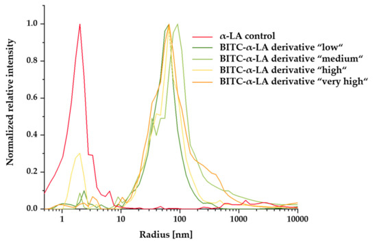 Using dynamic light scattering, the hydrodynamic radius and aggregation behavior of the untreated protein and BITC-α-LA- derivatives were evaluated. Figure 6 shows the size distribution histograms of the untreated α-LA protein control and the BITC-α-LA derivatives “low”, “medium”, “high”, and “very high”. For each sample, 20 scans were acquired, resulting in the average hydrodynamic radius and the correspondingly standard deviation (Table 3).