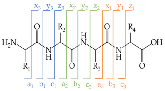 In mass spectrometry, information about the amino acid sequence of peptides/proteins can be obtained using different fragmentation methods [61]. On the one hand, it is possible to reconstruct the amino acid sequence of peptides and identify proteins from the fragmentation patterns. On the other hand, post-translational modifications such as BITC modification can be identified and localized as well. Depending on the fragmentation method chosen, different breaking points in the backbone of the peptides can be observed. For example, fragmentation yields a- and x-ions before peptide binding, b- and y-ions in peptide binding, and c- and z-ions following peptide binding. While the fragments of the C-terminal series are defined as x-, y-, and z-ions, the fragments of the N-terminal series are designated as a, b, and c (Figure 8). The labile amide bond in peptides is particularly susceptible to fragmentation, resulting in a breakage of the backbone between individual amino acids and resulting in N-terminal b-ion series and C-terminal y-ion series. Peptide bond fragmentation produces a ladder-like representation of the amino acid sequence in the MS/MS spectrum [62,63].