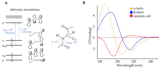 (A) Energy level diagram with electronic transitions of a peptide bond in the far UV region. Bonding, non-bonding, and antibonding p-orbitals () and two free electron pairs at the oxygen are shown [75,76]. (B) Characteristic CD spectra in the far UV region of “pure” α-helix, β-sheet, and disordered structures, redrawn from [85].