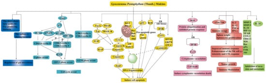 Tumors are closely related to the state of the body’s immune system, and strengthening immune function played an important role in the treatment of tumors. GPP (50 and 100 mg/kg for 12 days, i.g.) had an inhibitory effect on tumor growth in mouse forestomach carcinoma (MFC) gastric tumor-bearing mice, for which the tumor quality of the GPP group was significantly reduced. Furthermore, GPP could effectively prevent the immune organ atrophy and hypofunction of MFC gastric tumor-bearing mice, suggesting that the anti-tumor effect of GPP was closely associated with immune enhancement [38]. Liu et al. investigated the effect of GPS on the tumor growth in tumor-bearing mice, and the results showed that the growth of the tumor was inhibited by the intraperitoneal injection of 10–40 mg/kg GPS, and 20 mg/kg GPS exerted the strongest inhibitory effect. In addition, the number of splenic lymphocytes was increased, and the activity of natural killer (NK) cells was enhanced [39]. Studies had demonstrated that soluble Tim-3 played an important role in inhibiting the immune escape in a variety of cancer. Gypenoside XLIX (20 and 80 µg) could reduce the immune escape of non-small cell lung cancer A549 cells by promoting the stim-3/Tim-3 ratio [40].