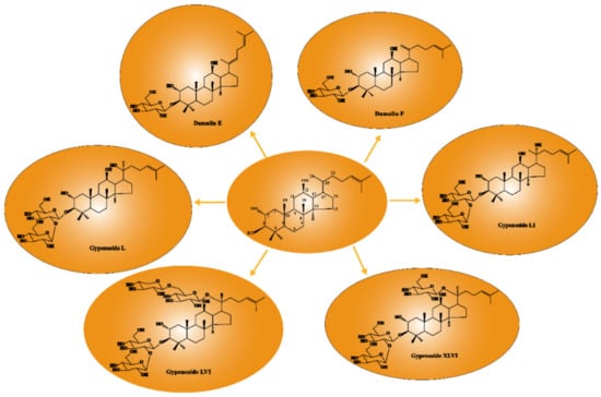 - Nguyen, P.H.; Gauhar, R.; Hwang, S.L.; Dao, T.T.; Park, D.C.; Kim, J.E.; Song, H.; Huh, T.L.; Oh, W.K. New dammarane-type glucosides as potential activators of AMP-activated protein kinase (AMPK) from Gynostemma pentaphyllum. Bioorgan. Med. Chem. 2011, 19, 6254–6260. [Google Scholar] [CrossRef]