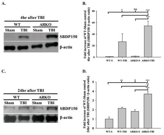 SBDP150 is an alpha-II-spectrin breakdown product cleaved by calpain cysteine proteases and is produced in necrotic cells [,]. It is a potentially reliable biomarker for severe TBI in animals and humans [,]. We first tested whether knockout of the androgen receptor affects the expression of the necrosis marker SBDP150 following TBI. We assessed SBDP150 levels in the WT and ARKO littermate brain tissue at 4 h and 24 h after TBI. Our results indicate that TBI significantly increased SBDP150 expression in the WT mice at 4 h (F [3,8] = 15.078; p < 0.05) and 24 h after TBI (F [3,8] = 25.317; p < 0.01) compared with the sham control group. No significant differences were found between the WT sham and ARKO sham groups after injury. Further, knockout of androgen receptor enhanced the expression of SBDP150 at 4 h after TBI compared with that in WT mice (p < 0.05) (Figure 1A,B). At 24 h after TBI, ARKO mice showed a much higher expression of SBDP150 than WT mice (p < 0.01) (Figure 1C,D). Our results showed that the expression of SBDP150 increased following TBI, and knockout of androgen receptor significantly enhanced TBI-induced SBDP150 expression. The present study suggests that androgen receptor knockout enhances necrosis in TBI.