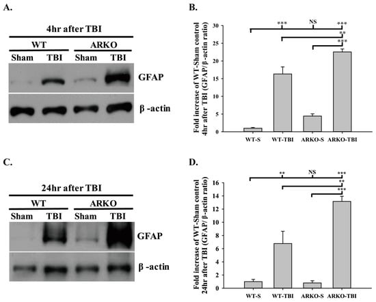 Androgen receptor knockout promoting GFAP expression induced by TBI GFAP expression was evaluated by Western blot. (A) Androgen receptor knockout induces GFAP expression at 4 h after TBI. (B) The quantitative data of GFAP level at 4 h following brain injury. (C) ARKO mice show TBI-induced GFAP expression enhancement compared with WT 24 h after TBI. (D) Quantitative data of GFAP level at 24 h following TBI. All data are presented as the mean ± standard error. NS, no significant difference; ** p < 0.01, and *** p < 0.001; n = 3 in each group.