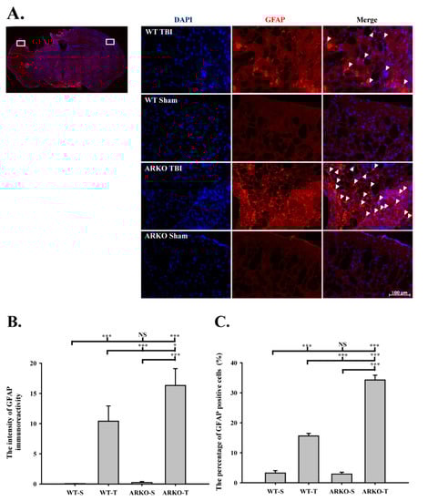 The GFAP biomarker expression is highly correlated with neurologic function, brain lesion, and behavioral outcomes []. A recent clinical study reported a direct association between GFAP in serum and clinical variables and the severity of neurologic complications in critically ill children []. Astrogliosis is not necessarily a maladaptive process and may provide benefits following TBI []. Since the characteristic of the TBI biomarker GFAP was assessed in the neurophysiology of glia [,,], our findings extend the importance of the androgen receptor in regulating GFAP activity in the context of TBI. In a clinical brain-injury treatment trial, plasma GFAP levels were significantly increased in patients with TBI from day 0 up to day 90 []. In a recent preclinical study of TBI, the serum levels of both GFAP and SBDP150 were used as biomarkers for predicting brain-cell death []. The present study supports the previous finding that the GFAP level increase correlates with behavioral and morphological changes []. Recently, it has been found that androgens protect the neurons from anti-inflammatory effects and astrocytes through activating AR []. Previous studies have demonstrated that testosterone reduces reactive astrocytes in peripheral motor neurons [] and brain injury []. ARs are generally thought to mediate the effects of androgens, and the expression of ARs is induced in glial cells following brain injury []. Our results show that AR knock out further increased the expression of GFAP, which is TBI-induced, around the injury site.