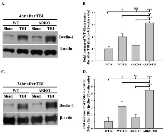 Androgen receptor knockout increases the TBI-induced Beclin-1 expression after brain injury. (A) TBI increases Beclin-1 expression. However, knockout of androgen receptor further increases Beclin-1 expression 4 h after injury. (B) Quantitative level of Beclin-1 expression at 4 h following TBI. (C) Beclin-1 expression shows a significant increase in ARKO mice, compared with WT mice in 24 h following TBI. (D) Quantitative level of Beclin-1 expression at 24 h following TBI. All data are presented as the mean ± standard error. NS, no significant difference; * p < 0.05, ** p < 0.01, and *** p < 0.001; n = 3 in each group.