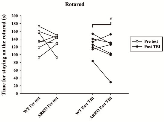 Androgen receptor knockout significantly decreases the motor function of mice after TBI. The time during which the mice stayed on the rod at an accelerating speed was evaluated before (pre) and 20 days after TBI (post). The white circles represent the rotarod test before TBI, and the black circles represent rotarod results in the WT and ARKO group after TBI. Each circle shows the mean of five trials of the rotarod test. The data points of each pair of littermates are connected by a line. Compared with the WT, the time spent on the rod shows a significant difference in the ARKO mice following TBI. All data are presented as the mean with paired t-test; * p < 0.05 versus wild-type; n = 7 in each group.