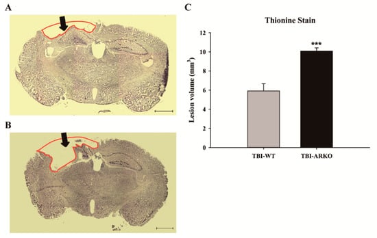 Androgen receptor deleted mice show a larger brain lesion volume than the WT following TBI. Thionine stained section of WT mice (A) and ARKO mice (B) brain after TBI. The black arrows indicate the impact site of TBI, 21 days following the injury. Red lines illustrate the lesioned area. (Images: x25 magnification, scale bar = 1 mm) (C) The total brain lesion volume is calculated. Compared with the WT impacted with TBI, androgen receptor knockout significantly increases the lesion volume in ARKO mice. All data are presented as the mean ± standard error; *** p < 0.001 versus wild-type; n = 7 in each group.