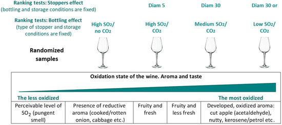 Ranking tests were carried out after 6, 12, and 24 months to compare the effect of the stoppers, and after six months of storage for comparison of the bottling effect. Each test comprised three or four glasses of the wine samples (Figure 2), which were randomized for each taster. The task for the panelists was to arrange the offered wines according to their oxidation state: the least oxidized wine—place 1, and the most oxidized sample—place 3 or 4 (depending on the number of glasses). Prior to the tasting, the concept of wine oxidation was discussed with the participants and the table from Figure 2 was given as a guidance.