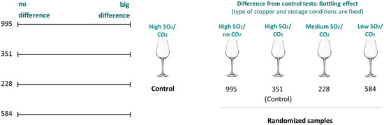 Ranking tests are an instrument to detect a perceivable difference between the wines, however they do not show how big the difference is between the samples. In order to focus on the more precise differences after 12 and 24 months of storage, the difference from control tests [31] were applied. There was no stress on any specific wine aroma or taste descriptors in these tests, however the panelists were asked to pay attention to the oxidation state of the samples. The task was to evaluate how different the four presented wines were from the control and to indicate this as a dash on the continuous scale (Figure 3). High SO2/CO2 variant was taken as the control, since this wine was expected to be the least oxidized in the test. The blind-control sample high SO2/CO2 was present also among the randomized samples and it was expected that this sample would be indicated by the panelists close to the beginning of the scale.