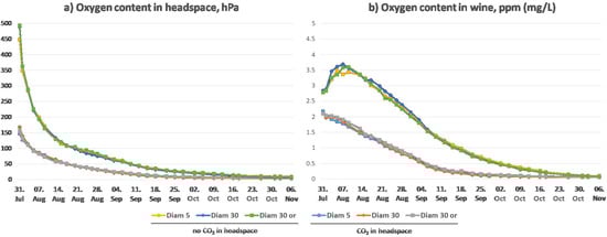 The flushing of the bottles’ headspace with CO2 demonstrated its efficiency. The measurements on the same day of bottling revealed that the oxygen content in the CO2–treated headspaces was about three times lower compared to that of the non-treated ones: about 150–170 hPa vs. 450–500 hPa, respectively (Figure 4). The concentration of dissolved O2 in wine also started to differ after bottling and a few hours later was 2.1–2.2 mg/L for the CO2–treated variants and about 2.8 mg/L for the non-treated bottles. The oxygen consumption by the wine led to the decrease in the content of dissolved O2 in the wine, except during the first days for those bottles without CO2 treatment. During this period, the process of O2 dissolution from the air was faster than the oxygen consumption by the wine, and after ten days the level of dissolved oxygen hit its maximum of 3.4–3.6 mg/L. Starting from this time point, all of the oxygen curves were declining and after about three months reached values close to zero. At that moment, most of the O2 present inside the bottle was consumed by wine, however this does not mean that the oxidation processes stopped. As was mentioned in the Introduction, O2 does not oxidize the wine components directly, but does so via intermediates, such as peroxide and other products, which do not disappear immediately. Moreover, the constant migration of oxygen through the stoppers also continues, but at a very low rate, typically measured in µg/L/day [13].