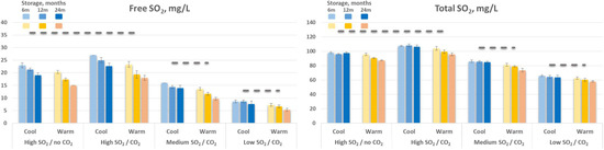 As a result, 24 bottling/storage variants were produced, which differed in the level of SO2 in the wine, CO2 treatment of the headspace, storage temperature and three types of stoppers. The initial levels of SO2 (one week after bottling) are indicated in Figure 1. The wines were analyzed at three storage points: 6, 12 and 24 months of storage. It is worth noting that the current article is a part of the long-term ongoing project, which involves the study of the storage properties of three types of wine stoppers, Diam 5, Diam 30, and Diam 30 origin. These stoppers are designed for multi-year bottle aging, five and thirty years, respectively. Thus, after the analysis of wines stored for two years, the variants, which differed only in the stopper type, demonstrated very similar results for all physicochemical analyses 2.2–2.6. Therefore, to achieve a convenient and clearer presentation of the results, the wines, which differed only in the stopper type, were grouped, and are considered as replicates in the Section 3. In this way, the bottling storage variants were reduced from 24 to 8, and were as follows:
