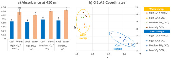 Since changes in wine color have been reported and discussed in many previous studies, we present here only the results after 24 months of storage. The light absorbance at 420 nm (A420 nm) is conventionally used to measure the color characteristics of white wines, including the browning index. The warm aged samples had higher A420 nm values than the cool ones and both of these groups formed clusters in the CIELAB coordinates (Figure 6). These outcomes correlate with our recent research where the application of UV-Vis spectroscopy combined with sensory analysis was proposed as a potential approach for studying temperature-related influence on wine during transportation [23]. Comparing the impact of different wine bottling variants on wine color, the Riesling wines were quite similar visually. However, color analysis revealed a tendency for the medium SO2 and low SO2 samples to have somewhat higher values, at A420 nm and on the yellow color + b * axis in the CIELAB coordinates. In other studies of white wines, for instance Cortese wines, the samples without SO2 addition at bottling were more colored after only three months of storage than the ones with added SO2 [40].