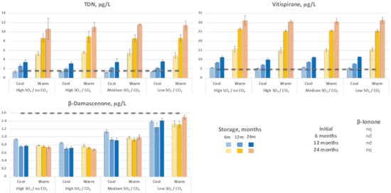 Concentration of C13-norisoprenoids in the wines after 6, 12 and 24 months of storage (mean of three samples with Diam 5, Diam 30 and Diam 30 origin stoppers ± standard deviation; nd—nondetectable, nq—nonquantifiable). Dotted lines correspond to the initial levels of C13-norisoprenoids after bottling.