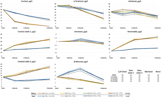 Linalool is one of the most important monoterpenoids in Vitis vinifera grapes and corresponding young wines. Its initial concentration of about 30 µg/L in the studied Riesling wine was slowly decreasing under cool storage conditions and decreased more intensively at the higher temperature, eventually reaching the non-detectable values after 24 months (Figure 9). Linalool content is usually prevented from a rapid fall by the acid hydrolysis of its bound form (glucoside precursor). Cleavage of the O-Glc bond during hydrolysis yields extra amounts of free linalool (Scheme 2). One of the important reactions of linalool in wine is its oxidation with the formation of a series of linalool oxides: cis-and trans-forms of furano-and pyrano-isomers [19]. In the current experiment, the stereoisomers of furano-linalool oxides were analyzed. A relatively fast accumulation of these compounds at a higher temperature was found, especially for linalool oxide 1. The content of the latter also increased slowly at the lower temperature, while the concentration of linalool oxide 2 somewhat declined, which was probably due to further chemical transformations of these compounds. A similar tendency was observed in the Vinhos Verdes wines after 20 months of aging: furano-linalool oxides sharply increased in its level while pyrano-linalool oxides did not show a significant evolution [53]. The other proposed oxidative reactions of linalool include the formation of nerol oxide and hotrienol. The latter, apparently, also underwent subsequent conversions since its content began to decrease after 12 months. It is noteworthy that the reduction of O2 content in the bottle headspace did not affect the described oxidative transformations. This is probably because the amount of dissolved oxygen in all variants was sufficient for the oxidation reactions to proceed. At the same time, previous research with spiked linalool to Semillon wine showed that nitrogen in the headspace resulted in somewhat less degradation of this compound after two years [43]. Higher SO2 level in the wine also had a limited impact on the transformations of monoterpenes and monoterpenoids in the actual study. It did not preserve the content of linalool (no evident correlation was found between linalool and SO2 levels in the PCA analysis, Supplementary Figure S2) but tended to reduce the formation of hotrienol. In turn, the wine storage temperature was the most influential factor for the various transformations of monoterpenes and monoterpenoids.