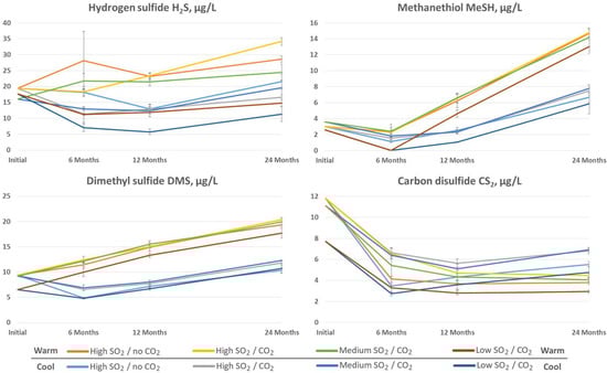 Possible formation of unpleasant “reductive” aromas in wine is another important aspect of the aging process. LMWSCs are usually responsible for this wine defect and are characterized by off-odors, such as rotten egg, garlic, cabbage etc. [13]. Four LMWSCs presented in Figure 11 were found in the studied Riesling wine initially and in the subsequent stages of storage. The opposite chemical concept of “reduction” is “oxidation”. Therefore, it was of great interest to monitor the development of LMWSCs in the wine variants with lower and higher oxygen contents, as well as with different levels of antioxidant SO2.