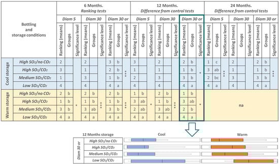 Results of sensory analysis of the wines after 6, 12 and 24 months of storage: comparison of bottling and storage conditions effects. An example of the highlighted difference from control test (median is indicated by the vertical lines; the left and right sides of the box represent the 1st and 3rd quartiles, respectively; the whiskers represent the minimum and maximum values). Asterisks represent significant differences within each sensory test: * p < 0.05; *** p < 0.001; empty cell—no significant differences.