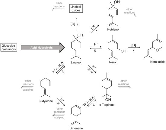 Proposed transformations of linalool in wine during the aging process (based on the previous publications [12,19] and our observations): (i) oxidation; (ii) acid-mediated dehydration; (iii) acid-mediated isomerization; (iv) acid-mediated cyclization; (v) oxidative cyclization.