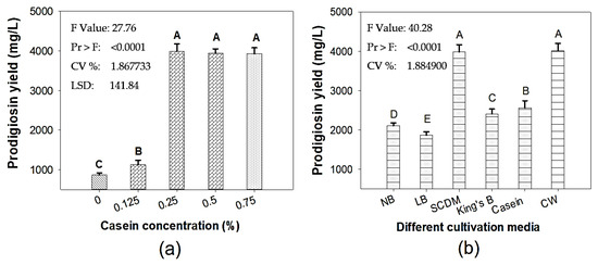 - Production of PG in different commercial media: various commercial materials, including Nutrient broth (NB), Luria-Bertani broth (LB), King’s B, soybean casein digest medium (SCDM), and casein, were used as the C/N sources for fermentation, in the same conditions (*), with S. marcescens TNU01. All the commercial media were used at 1% for the preparation of the culture medium. Cassava wastewater was supplemented with 0.25% casein and also used for fermentation in the above conditions (*) to compare the PG yields among these substrates.