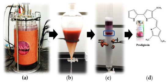 - Tao, J.; Wang, X.; Wei, D.; Shen, Y.; Tong, W. Development of an adsorption procedure for the direct separation and purification of prodigiosin from culture broth. Biotechnol. Appl. Biochem. 2004, 40, 277–280. [Google Scholar] [CrossRef] [PubMed]
