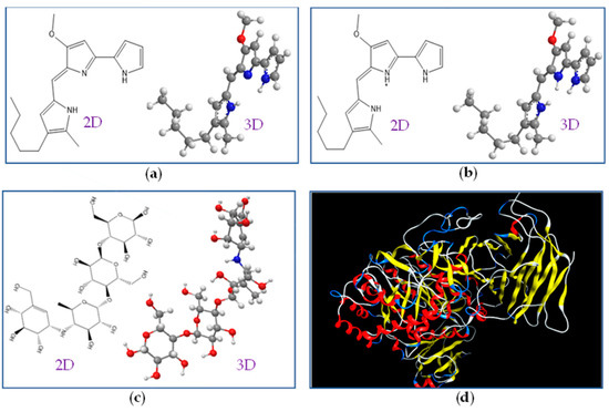 - Krishna, P.S.; Vani, K.; Prasad, M.R.; Samatha, B.; Bindu, N.S.V.S.S.S.L.H.; Charya, M.A.S.; Shetty, P.R. In –silico molecular docking analysis of prodigiosin and cycloprodigiosin as COX-2 inhibitors. SpringerPlus 2013, 2, 1–6. [Google Scholar] [CrossRef] [Green Version]