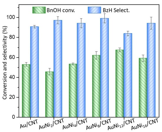 The alkaline environment is intimately involved in the oxidation of benzyl alcohol to obtain benzaldehyde. The catalytic performances influenced by alkali dosage are reported in Figure 2b using AuNi8/CNT as typical catalyst. No observable conversion of benzyl alcohol can be detected in the absence of alkali, suggesting the indispensable base environment for selective oxidation under such mild conditions. The oxidation conversion of benzyl alcohol increases with the alkali dosage. Nevertheless, the selectivity of benzaldehyde volcanically raises as the molar ratio of alkali/BnOH changes from 0.12–1.25. The selectivity of benzaldehyde reaches around 99% with alkali/BnOH ratio of 0.42. Lolli et al. [19] suggested that benzyl alcohol underwent Cannizzaro reaction in the presence of high concentration of alkali base. The H on the -OH of benzyl alcohol bonded with water in the presence of alkali to form a tetrahedral intermediate (C6H5-CH2-O−) and facilitated the formation of benzaldehyde by subsequently losing the hydride ion [20]. However, the presence of excessive base environment could directly result in the deep oxidation of benzaldehyde into by-product benzoic acid. As the molar ratio of alkali/BnOH is higher than 0.84, the selectivity of benzaldehyde is reduced to 70%. Benzoic acid is accumulated as by-product under such conditions.