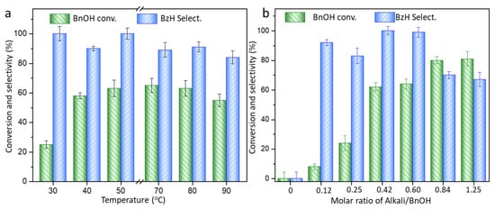 Catalytic performance of the AuNi8/CNT catalyst as a function of reaction temperature (a) and the alkali dosage (b). Reaction condition: Reaction at 50 °C for 3 h, O2 flow rate of 40 mL/min, 10 mg catalyst, alkali/BnOH = 0.42:1, BnOH/Au = 650:1 (molar ratio), if not specified. BnOH—benzyl alcohol, BzH—benzaldehyde.