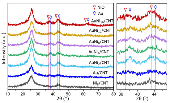 The distribution and construction of NiO and Au crystals in the AuNix/CNT samples directly manipulate chemical compositions and catalytic behaviors. Herein, the crystalline structures of AuNix/CNT catalysts displayed by the XRD patterns are shown in Figure 3. The strong and broad diffraction peak at 25.9° is assigned to the (002) plane of amorphous carbon in CNT. The monometallic Ni8/CNT and Au/CNT references were also tested for comparison. Diffraction peak at 2θ = 43.3° can be observed and related to the (200) plane of bunsenite NiO (JCPDS No: 47-1049) [21]. Diffraction peaks at 38.2°, 44.4° and 64.6° can be assigned to the (111), (200), and (220) planes of face-centered cubic structure of Au (JCPDS No: 04-0784) [22].
