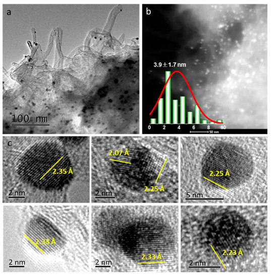 High-resolution TEM images in Figure 4c display the typical morphology of particles dispersed on CNT surface. The presence of lattice plane with 2.35 Å confirms it as Au (111) face of Au nanoparticles [25]. However, it is surprising that interplanar distances in the range of 2.23–2.33 Å are observed on the edges of particles, which are between the lattice spaces of Au (111) (2.35 Å) and NiO (200) (2.07 Å) crystal planes [26]. In fact, it must be noted that the migration of single metal atoms was reported easily occurring during the synthesis, thermal treatment, and even reaction [27,28]. Combining the XRD results, it is inferred that Ni atoms may migrate into the surface atom layer of Au particles, causing the lattice constraint of the upper layer of Au particles [13]. These features are consistent with the classical variation in peak location in the XRD patterns.