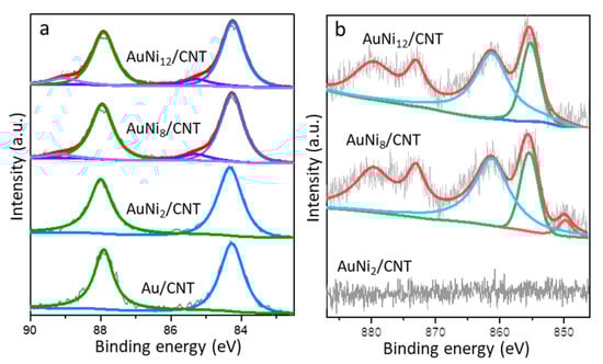 The XPS spectra of Au 4f and Ni 2p core levels were performed to identify the surface chemical states of typical samples (Figure 6 and Table S1). The characteristic peaks maximized at 84.0 eV and 87.7 eV can be assigned to the Au 4f5/2 and 4f7/2 regions [32]. Only metallic Au0 exists on the surface of Au/CNT and AuNi2/CNT catalysts. Shoulder peaks appear after deconvolution at binding energy of 85.3 eV in both the AuNi8/CNT and AuNi12/CNT samples. They are assigned to the Auδ+ species (0 < δ < 1) [30], which was reported as a sign of strong Au–metal oxide (MOx) interaction [33]. It is evident that the co-existence of Ni species does not obviously change the chemical state of gold species at lower Ni/Au atomic ratio (≤2:1), since most of the Ni species randomly decorate the CNT surface. Combining the XPS results with the TEM images and XRD patterns, Ni species are not simply dispersing on or decorating the CNT as the Ni/Au ratio reaching 8:1. Contact between Au particle surface and Ni species is generated after the thermal treatment. Higher atomic ratio of Ni induces stronger interaction between Au and NiO due to the intimately constructed Au-Ni-Ox hybrid interface.