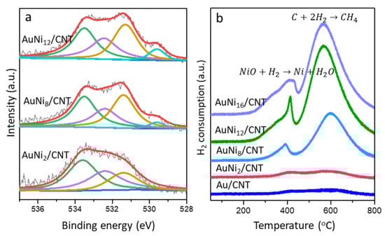 XPS spectra of the O 1s core level (a) and H2-TPR profiles (b) of different AuNix/CNT samples.