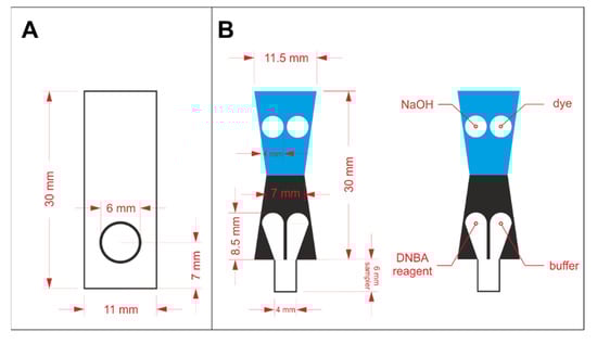 In order to prepare a properly operating sensor using paper as solid support, hydrophilic and hydrophobic regions must be defined. Hydrophobic barriers prevent reagents and samples from spreading in an undefined way and they are necessary for appropriate precision and reproducibility of the sensors. In this work, hydrophobic barriers were manufactured by means of the wax printing technique [18]. The hydrophobic barriers were designed in CorelDraw software and printed on Whatman paper with a wax printer (ColorQube 8570, Xerox, CT, USA). The architecture of the hydrophobic barriers for protein assay optimization and protein to creatinine ratio determination is shown in Figure 1A,B, respectively. In the latter case, the key aspect in the sensors’ design is splitting the stream of the flowing sample in a reproducible way, so that the sample can react independently with two different sets of reagents. The sensors shown in Figure 1A were printed on Grade 1 paper, while the ones shown in Figure 1B were printed on Grade 4 paper. The printed paper was heated for 2 min at 120 °C in a laboratory dryer to allow the wax to melt and penetrate the pores in the paper’s volume. After the wax solidified, hydrophobic barriers were defined.