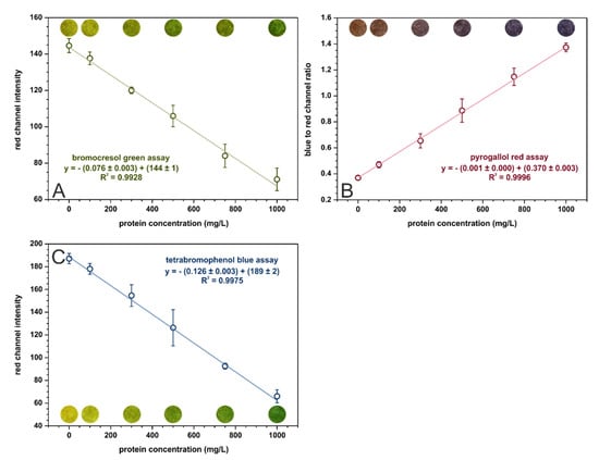 Calibration dependencies for (A) bromocresol green, (B) pyrogallol red, and (C) tetrabromophenol blue assays registered in the optimal conditions, n = 3. The colorful spots are the actual photos of the detection zones of paper-based sensors after the introduction of sample with an appropriate BSA concentration.