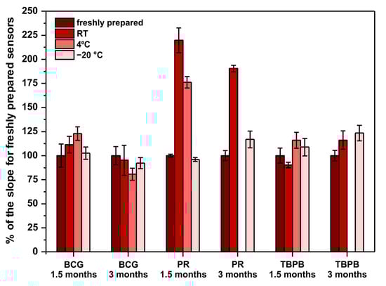 Sensors’ long-term stability study. The parameter on ordinate is the percent of the obtained calibration curve’s slope in comparison to the slope for freshly prepared sensors—100% would mean that the sensors do not change their sensitivity when subjected to storage. Note that there are no bars for PR and TBPB stored in 4 °C for 3 months due to sensors’ destruction by moisture in the fridge.
