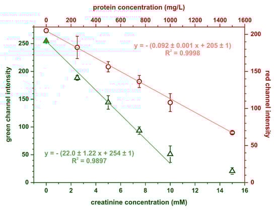 The calibration curves for creatinine and protein obtained in the optimal conditions are shown in Figure 5. Limits of detection and quantification were estimated based on the following equations: LOD = 3.3SDy/S and LOQ = 10SDy/S, where SDy is the standard deviation of the calibration curve’s intercept and S is its slope. For protein determination, the calculated limits of detection and quantification were 35 and 107 mg·L−1, respectively, while for creatinine determination, these parameters were 0.15 mmol·L−1 and 0.46 mmol·L−1, respectively. Precision, expressed as relative standard deviation, was 6% (at 750 mg·L−1 BSA) for the protein assay and 7% (at 7 mmol·L−1 creatinine) for the creatinine assay.