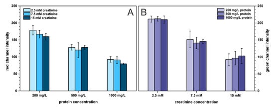 Last but not least, the cross-reactivity of the two analytes was investigated to ensure that neither protein affects creatinine determination nor creatinine influences protein determination. Creatinine and protein were studied on three arbitrary chosen concentration levels described as: low (200 mg·L−1 BSA, 2.5 mmol·L−1 creatinine), medium (500 mg·L−1 BSA, 7.5 mmol·L−1 creatinine), and high (1000 mg·L−1 BSA, 15 mmol·L−1 creatinine), resulting in nine combinations of binary mixtures of both analytes. The outcome of this experiment is presented in Figure 6. As can be seen, the presence of protein does not affect creatinine determination and the same trend is noticeable for protein determination. Only for low protein concentration, the registered signal (red channel intensity) slightly decreases with increasing creatinine content. This is probably related to increasing solution pH with an increasing creatinine (which is an amine) concentration. This affects the color of the pH-sensitive TBPB dye. Nonetheless, the developed paper-based sensors can be employed for reliable determination of two analytes—protein and creatinine—at the same time and on a single paper strip.