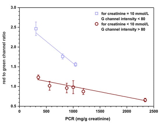 Calibration-free sensing devices are of significant interest as point-of-care tests. Such sensors have the potential to fulfill ‘ASSURED’ criteria (affordable, sensitive, selective, user-friendly, rapid and robust, equipment-free, deliverable to end user) developed by WHO for on-site diagnostic tests [27]. For this reason, a possibility of semiquantitative assessment of the protein to creatinine ratio based on appropriate channels intensities, without calculating the concentration of each analyte relying on previously registered calibration curves, was examined. Red channel intensities were taken from protein detection zones and green channel intensities were taken from creatinine detection zones obtained in the previous experiment (Section 3.4). The ratios of these intensities were calculated to establish if there is a correlation between this quantity and the protein to creatinine ratio. The outcome of this experiment is plotted in Figure 7.