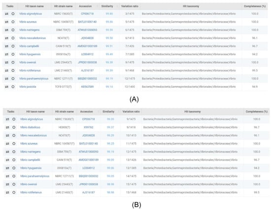 Homology analysis of the 16S rDNA sequences of LHF01 (A) and LHF02 (B).