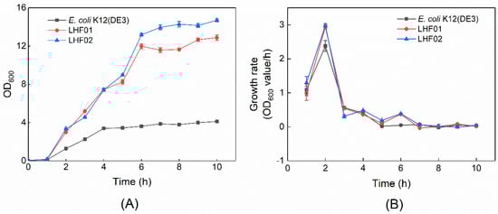 where is the generation time, is the detection time interval (h), is the number of generations, is the end-point OD600, and is the starting OD600. E. coli K12(DE3) cultivated at 37 °C and 200 rpm in the Luria–Bertani (LB) medium was included as a control. The LB medium contained 5 g/L yeast extract, 10 g/L Bacto tryptone, and 10 g/L NaCl.